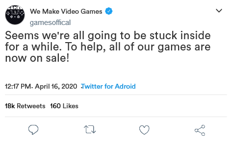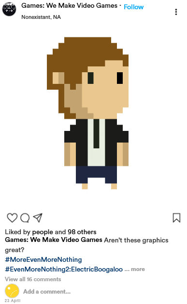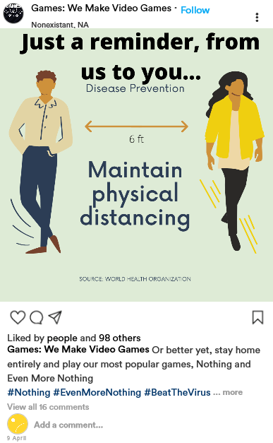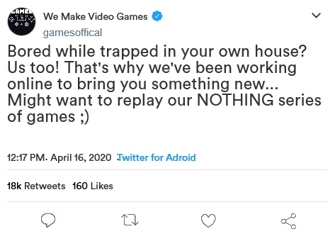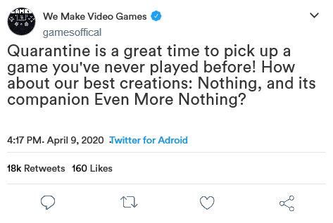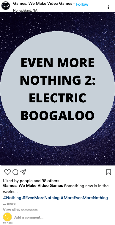 Rather than choose an existing company to pretend I work for, I made one up. Wanting to try to keep this light and poke a little fun at the imaginary aspect of this assignment, I decided to name this imaginary video game company “Games”. Their tagline is, of course, “We make video games.” Among their most popular products is a game called “Nothing”, and its companion game, “Even More Nothing”. Before the strike of the coronavirus and the quarantine, the company had been developing a new game to add to their popular titles. With the quarantine happening, the company has taken the chance to encourage people to play or reply these products as a way to hype up their new game, along with releasing teasers. And what else would this new game be called but “Even More Nothing 2: Electric Boogaloo”? Well, it made me chuckle at least.